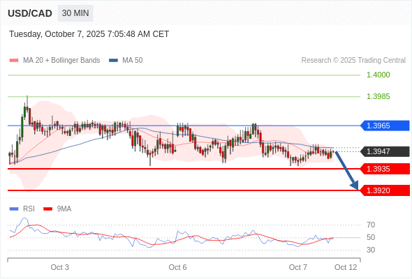 在 1.3965 之下,看跌,目标价位为 1.3935 ,然后为 1.3920 。