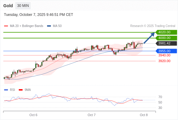 在 3955.00 之上,看涨,目标价位为 4000.00 ,然后为 4020.00 。