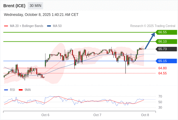 在 65.15 之上,看涨,目标价位为 66.10 ,然后为 66.55 。
