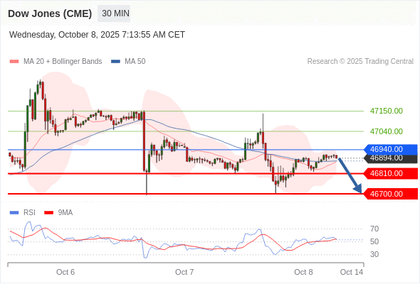 在 46940.00 之下,看跌,目标价位为 46810.00 ,然后为 46700.00 。