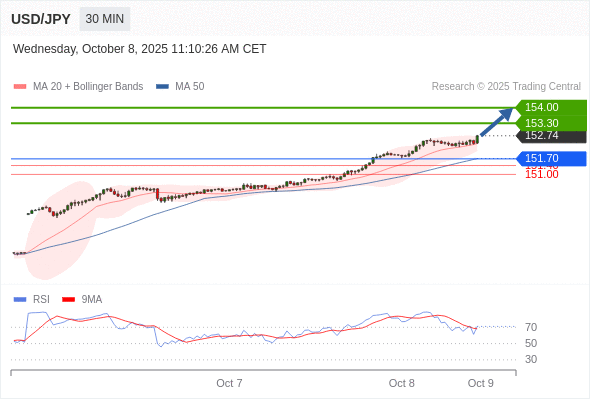 在 151.70 之上,看涨,目标价位为 153.30 ,然后为 154.00 。