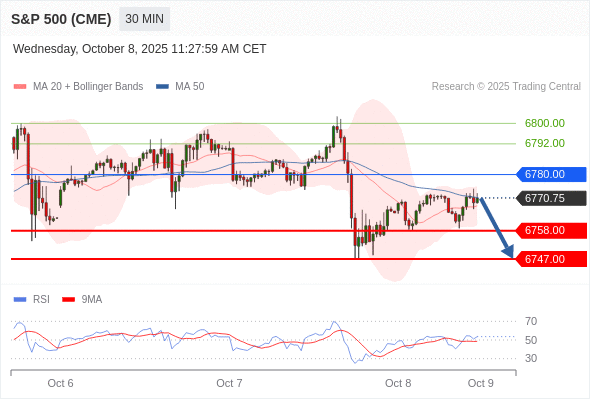 在 6780.00 之下,看跌,目标价位为 6758.00 ,然后为 6747.00 。