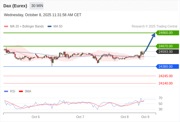在 24380.00 之上,看涨,目标价位为 24670.00 ,然后为 24860.00 。