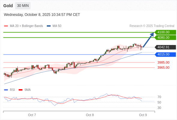在 4015.00 之上,看涨,目标价位为 4080.00 ,然后为 4100.00 。