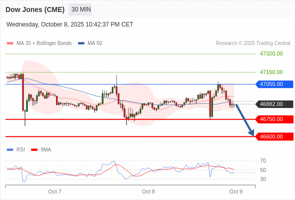 在 47055.00 之下,看跌,目标价位为 46750.00 ,然后为 46660.00 。