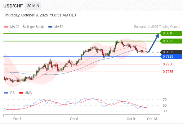 在 0.7995 之上,看涨,目标价位为 0.8025 ,然后为 0.8040 。