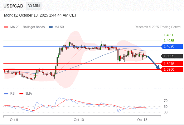 在 1.4020 之下,看跌,目标价位为 1.3975 ,然后为 1.3960 。