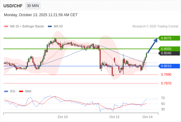 在 0.8010 之上,看涨,目标价位为 0.8050 ,然后为 0.8075 。