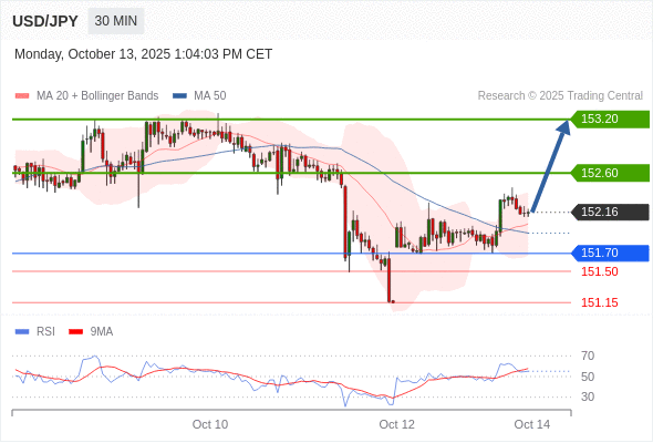 在 151.70 之上,看涨,目标价位为 152.60 ,然后为 153.20 。
