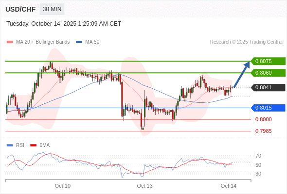 美元/瑞郎 当日内: 在0.8015之上,看涨。