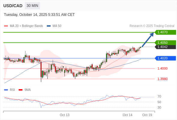 在 1.4020 之上,看涨,目标价位为 1.4050 ,然后为 1.4070 。