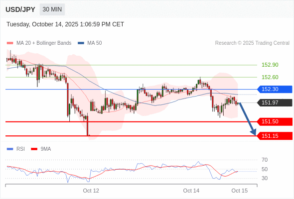 在 152.30 之下,看跌,目标价位为 151.50 ,然后为 151.15 。