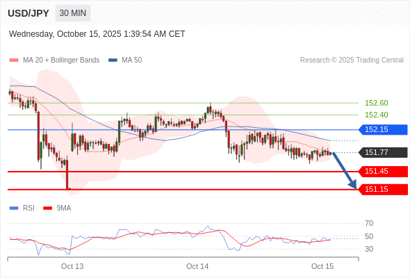 在 152.15 之下,看跌,目标价位为 151.45 ,然后为 151.15 。