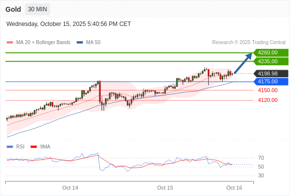 在 4175.00 之上,看涨,目标价位为 4235.00 ,然后为 4260.00 。