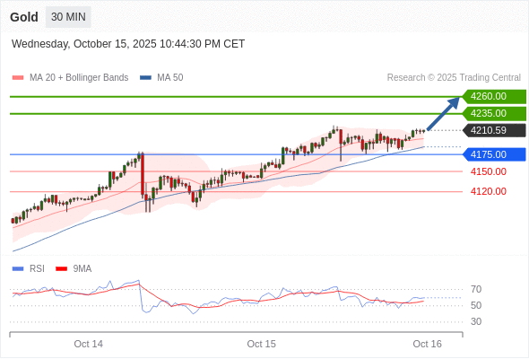 在 4175.00 之上,看涨,目标价位为 4235.00 ,然后为 4260.00 。