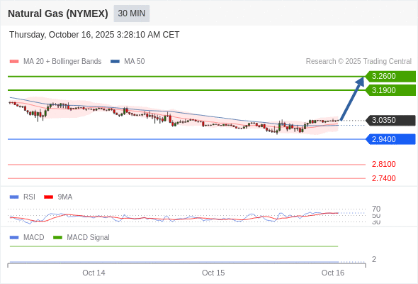 备选策略: 如跌破 2.9400 ,Natural Gas (NYMEX) (NOV5) 目标方向定在 2.8100 和 2.7400 。