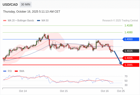 在 1.4060 之下,看跌,目标价位为 1.4005 ,然后为 1.3985 。