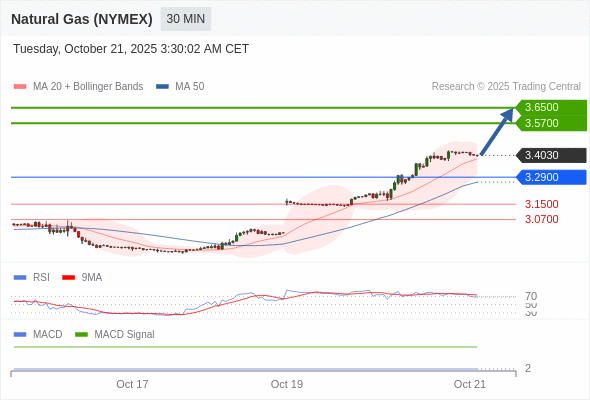 备选策略: 如跌破 3.2900 ,Natural Gas (NYMEX) (NOV5) 目标方向定在 3.1500 和 3.0700 。