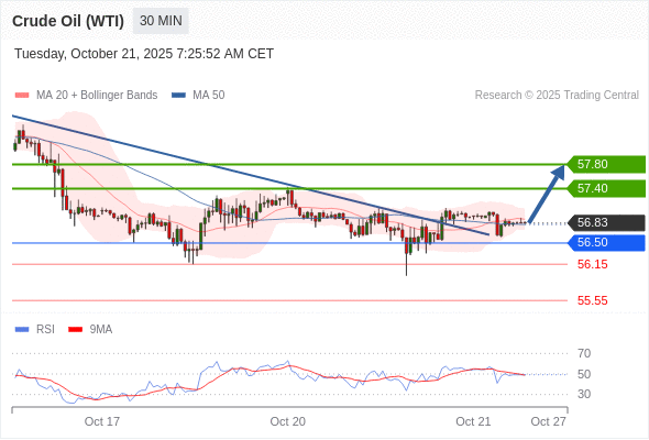 在 56.50 之上,看涨,目标价位为 57.40 ,然后为 57.80 。