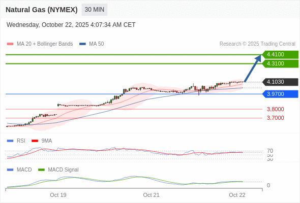 Natural Gas (NYMEX) (DEC5) 当日内: 看涨,当 3.9700 为支撑位,目标定在4.4100。
