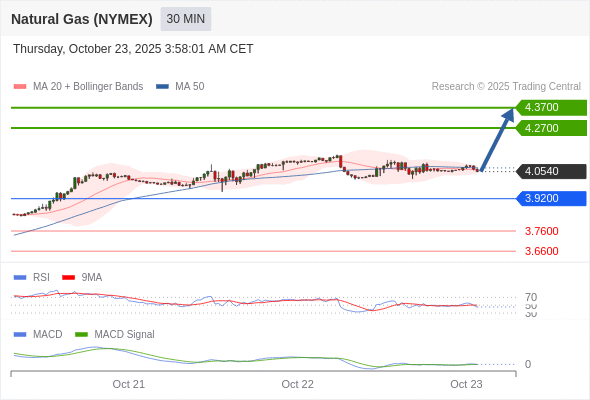 备选策略: 如跌破 3.9200 ,Natural Gas (NYMEX) (DEC5) 目标方向定在 3.7600 和 3.6600 。