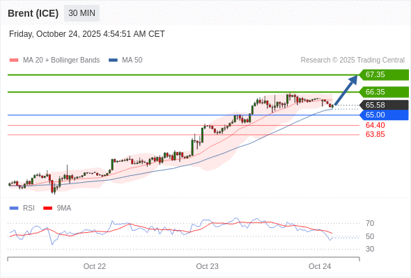 布伦特原油 (ICE) (Z5) 当日内: 超短线(当日内)支撑位在65.00附近。