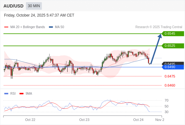 在 0.6490 之上,看涨,目标价位为 0.6525 ,然后为 0.6545 。