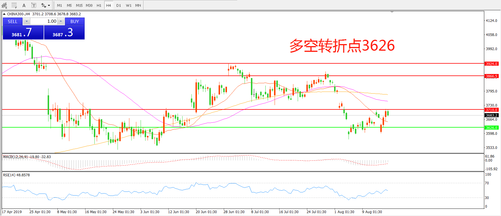 4小时图看,沪深300指数震荡反弹 后触碰3710附近小幅回落,整体走势有所回暖,均线系统有拐头迹象,MACD绿柱走平,日内延续震荡概率较大