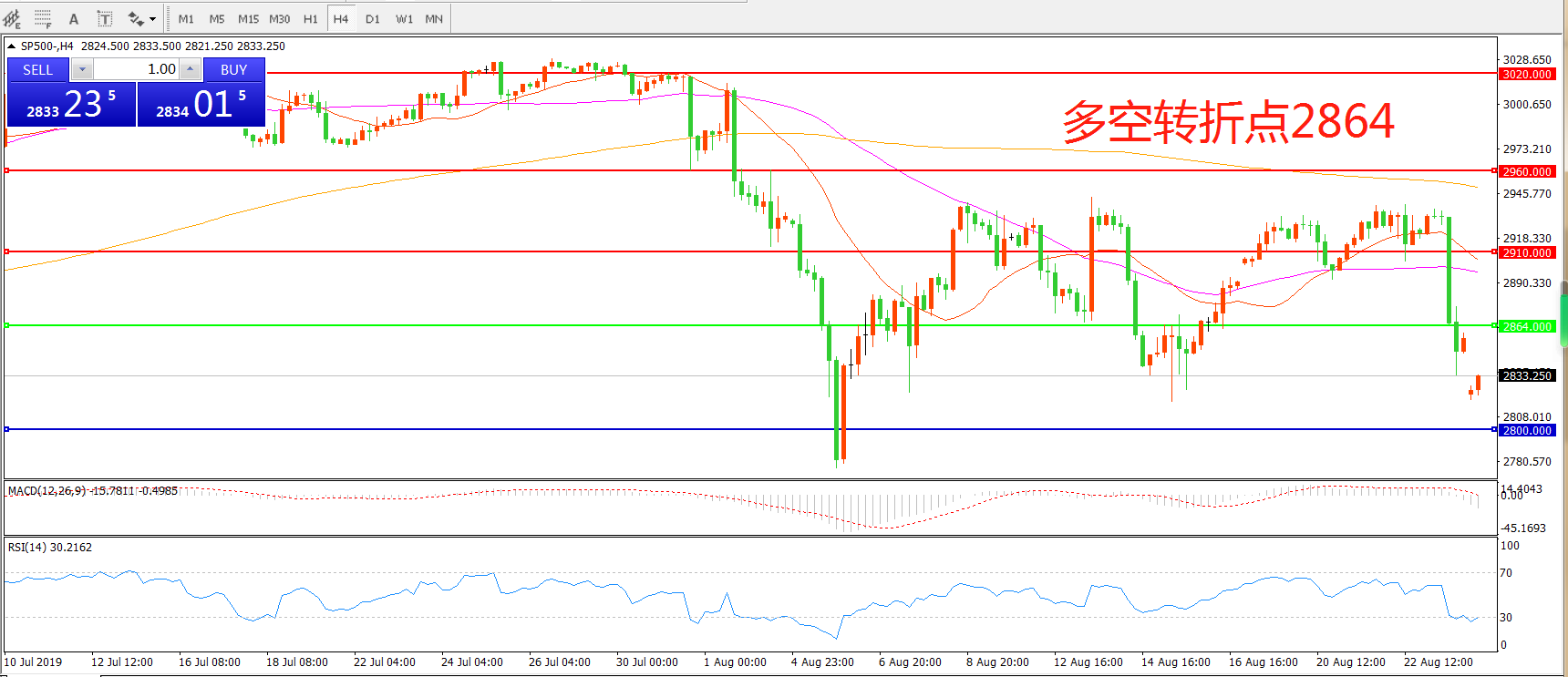 上周市场的主要焦点都放在杰克逊霍尔年会上美联储主席鲍威尔的讲话上,但在美联储主席周五讲话前两小时,国务院发出公告,中方决定对美750亿美元商品加征关税,市场瞬间掀起波涛汹涌,美股、美元暴跌,标普500指数十一大板块全线下跌,最终收报2856点。