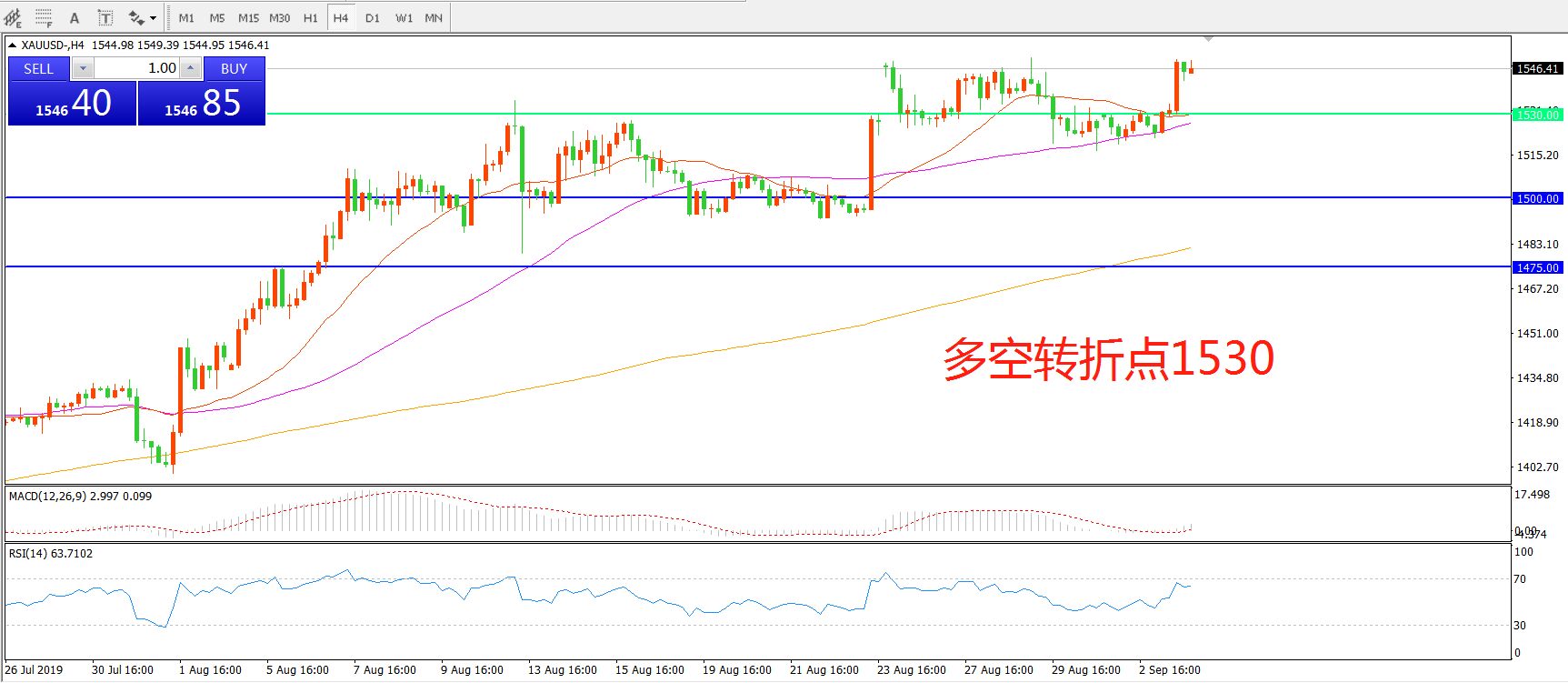 周二(9月3日),美国最新公布的经济数据表现异常疲弱,8月ISM制造业PMI跌至2016年1月以来最低水平,且为2016年8月以来首次跌破荣枯线.理论上讲任何低于50的数字都意味着经济收缩,而中美贸易关系和英国退欧的不确定性也进一步提升了黄金的避险吸引力,金价暴力拉涨逾1%,最终收报1547.89美元/盎司。