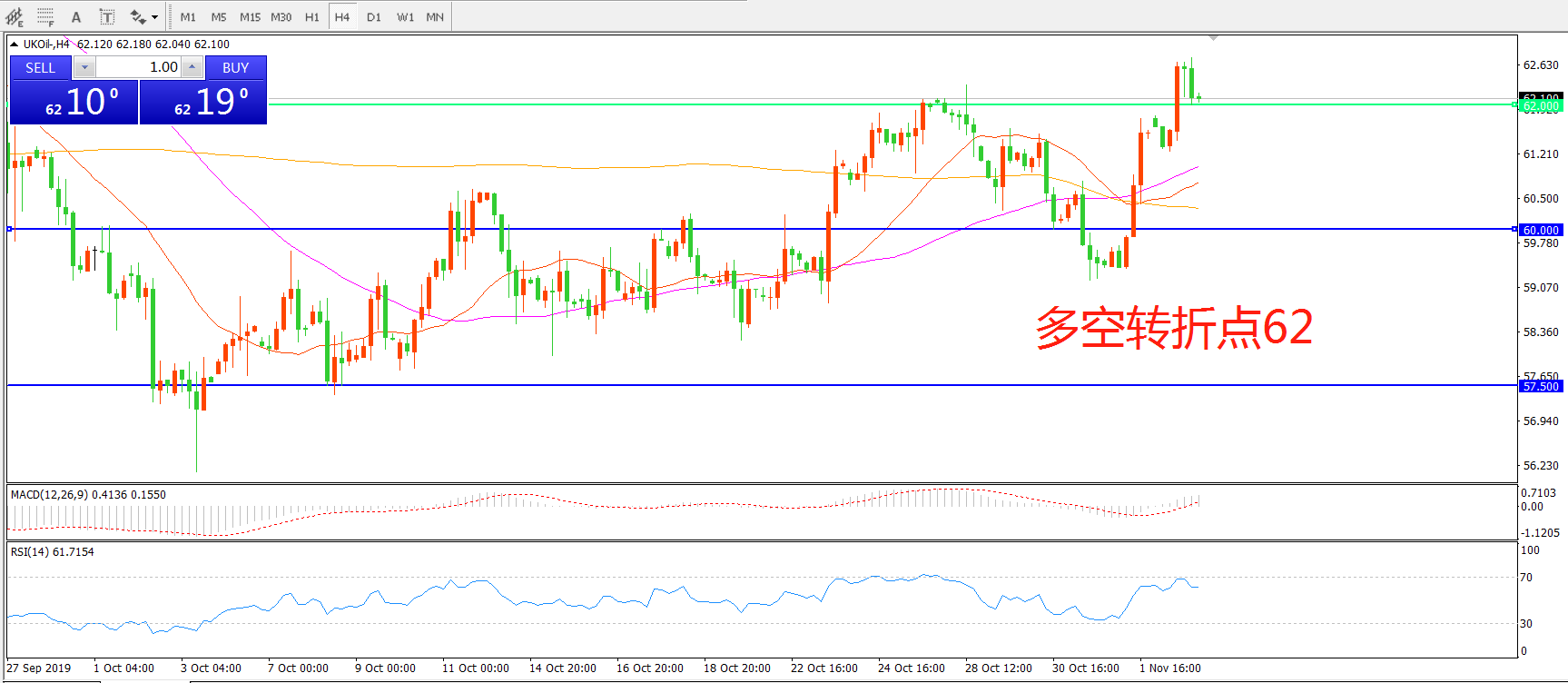4小时图看,油价长阳突破62美金站稳,整体走势偏强,均线系统粘合形成下方支撑,MACD红柱增加,RSI指标走平,日内延续上行概率较大。