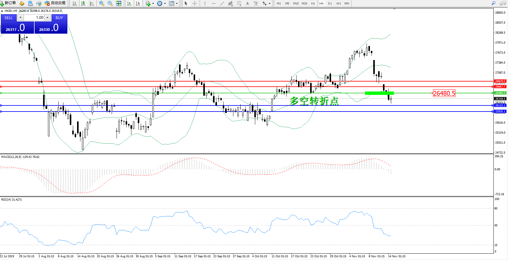 香港恒生指数1114日(周四)收盘下跌247.77点,跌幅0.93%,报26323.69点;港股早上低开后反弹倒升,但仅升34点,恒指高见26605,随后再度下跌,最多跌285点,低见26286,更接近26000关口。鲍威尔明确表态,“只要经济保持增长走势,美联储不会在短期内调整利率”。美方透露出对第一阶段协议还存在分歧, 中美贸易磋商再次卡壳,投资者正在评估美联储主席鲍威尔的国会证词、美国国会针对特朗普弹劾调查案的首次公开听证会、以及国际贸易局势的进展。恒指失去最大利好预期的全市场可能又会开始回调,震荡。