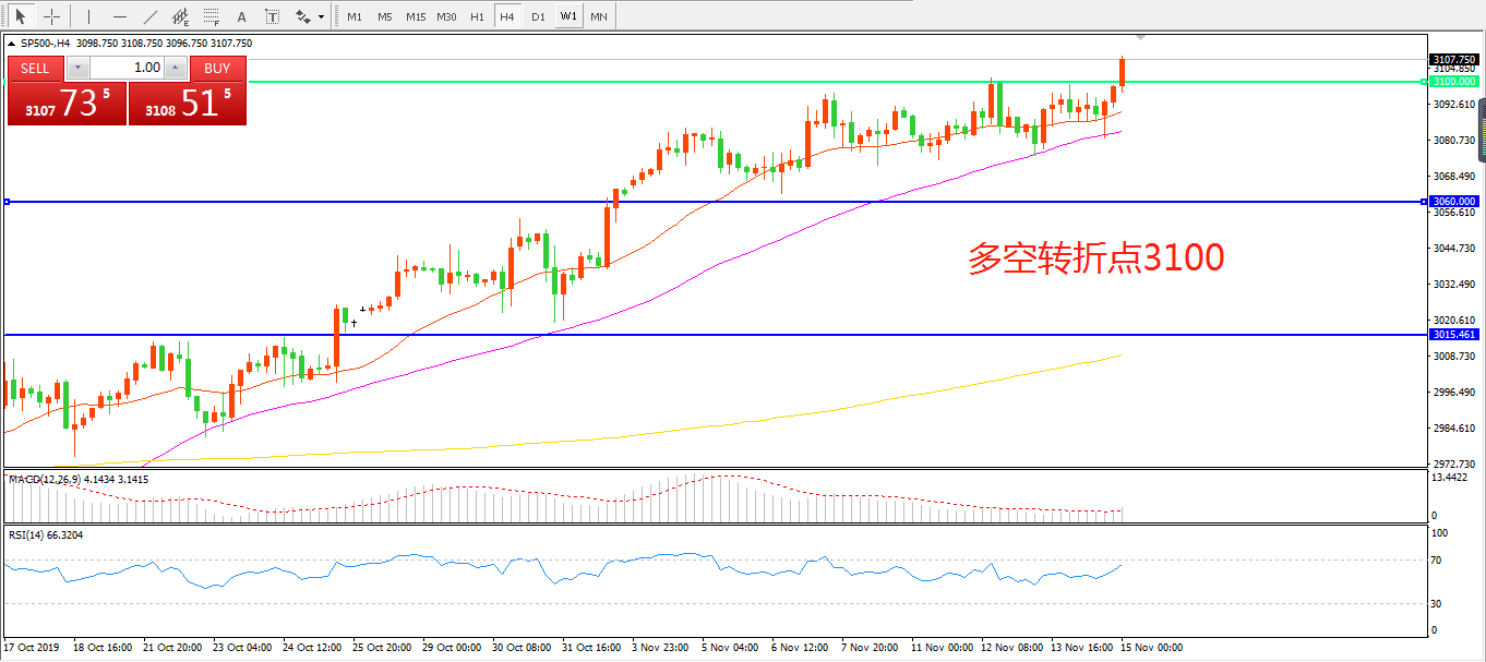 4小时图看,标普500维持高位震荡,整体走势偏强,回踩3060支撑之后上行趋势较为明显,均线系统呈多头排列,MACD红柱减少,RSI指标向上,日内延续上行概率较大。