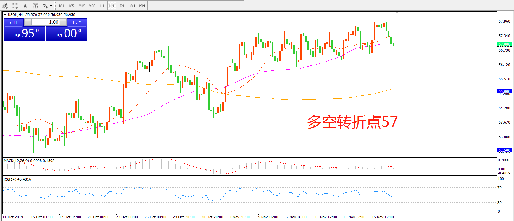 4小时图看,油价呈现冲高回落走势,57美金成为短期支撑,均线系统走平,MACD红柱减少,RSI指标走平,如不能冲破盘整区域,短期有下行风险。