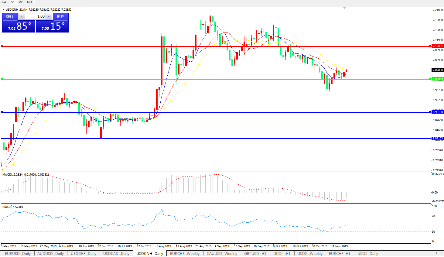 技术面简析:日图均线呈空头排列但短期均线走强迹象明显,汇价7.0关口附近小幅上攻,MACD运行于0轴下方且量能微收缩,RSI有反弹走升迹象,预计短期汇价将在7.0关口附近整理,中期汇价需等待美元指数及中美贸易谈判进展指引。
