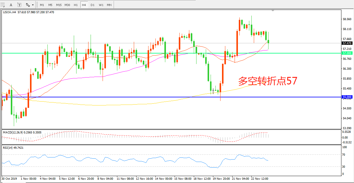 4小时图看,油价延续高位震荡,55周期均线成为下方支撑,整体表现相对强势,MACD红柱减少,RSI指标走平,日内有进一步上行可能。