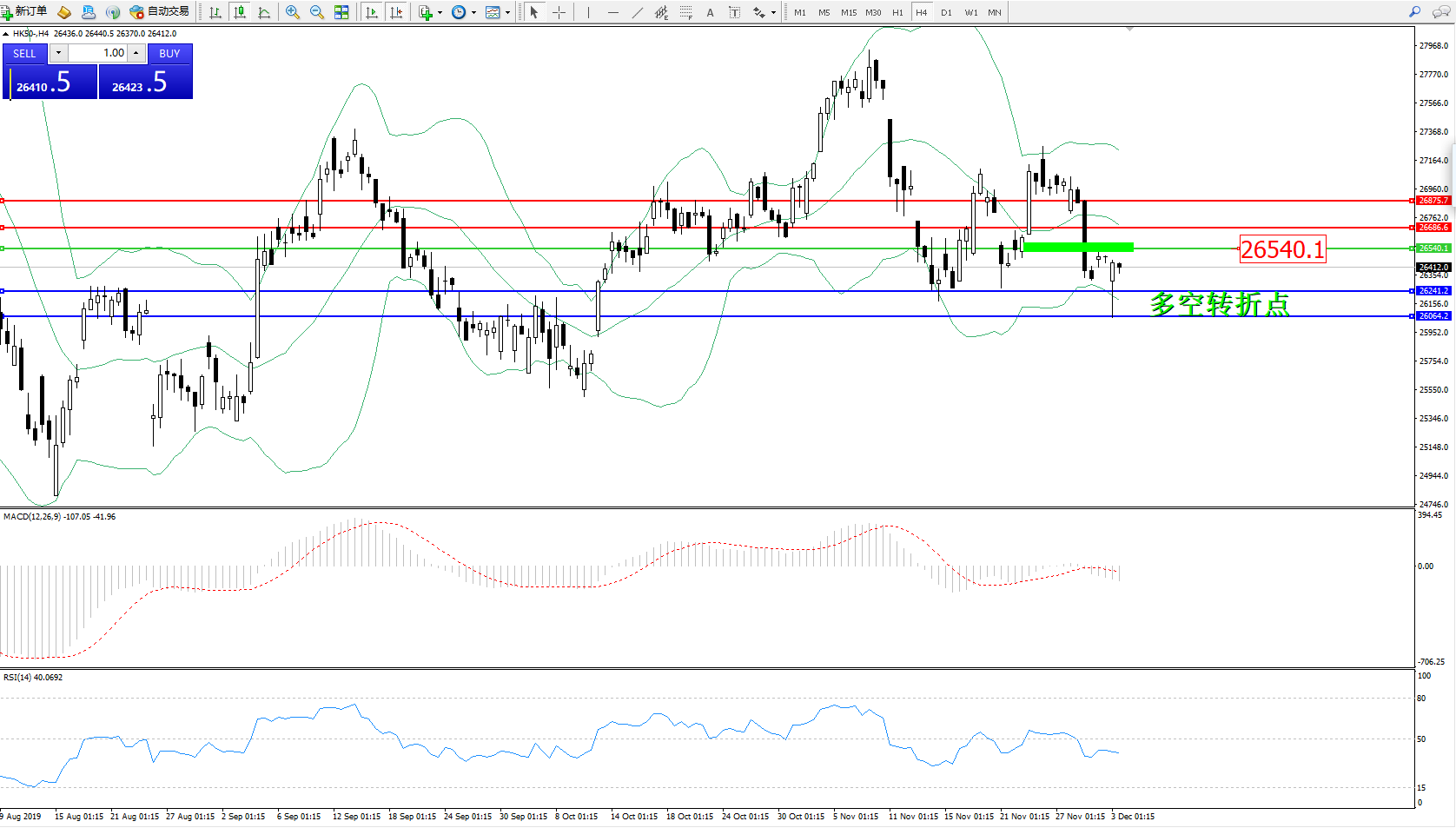 香港恒生指数12月3日(周二)收盘下跌53.42点,跌幅0.20%,报26391.30点;港股早上跟随外围下跌而低开,随后再扩大跌幅,最多跌381点,恒指低见26063,创出近三个月低位,再迫近26000关口。恒指维持了弱势震荡走势,成交量的萎缩也反映出投资者普遍处于观望状态。整体而言,恒指仍未摆脱弱势的状态,接下来还是要密切关注国际事态的走向。临近节日下恒指市场缺乏利好消息,加上美股回吐,恒指下试机会加大。