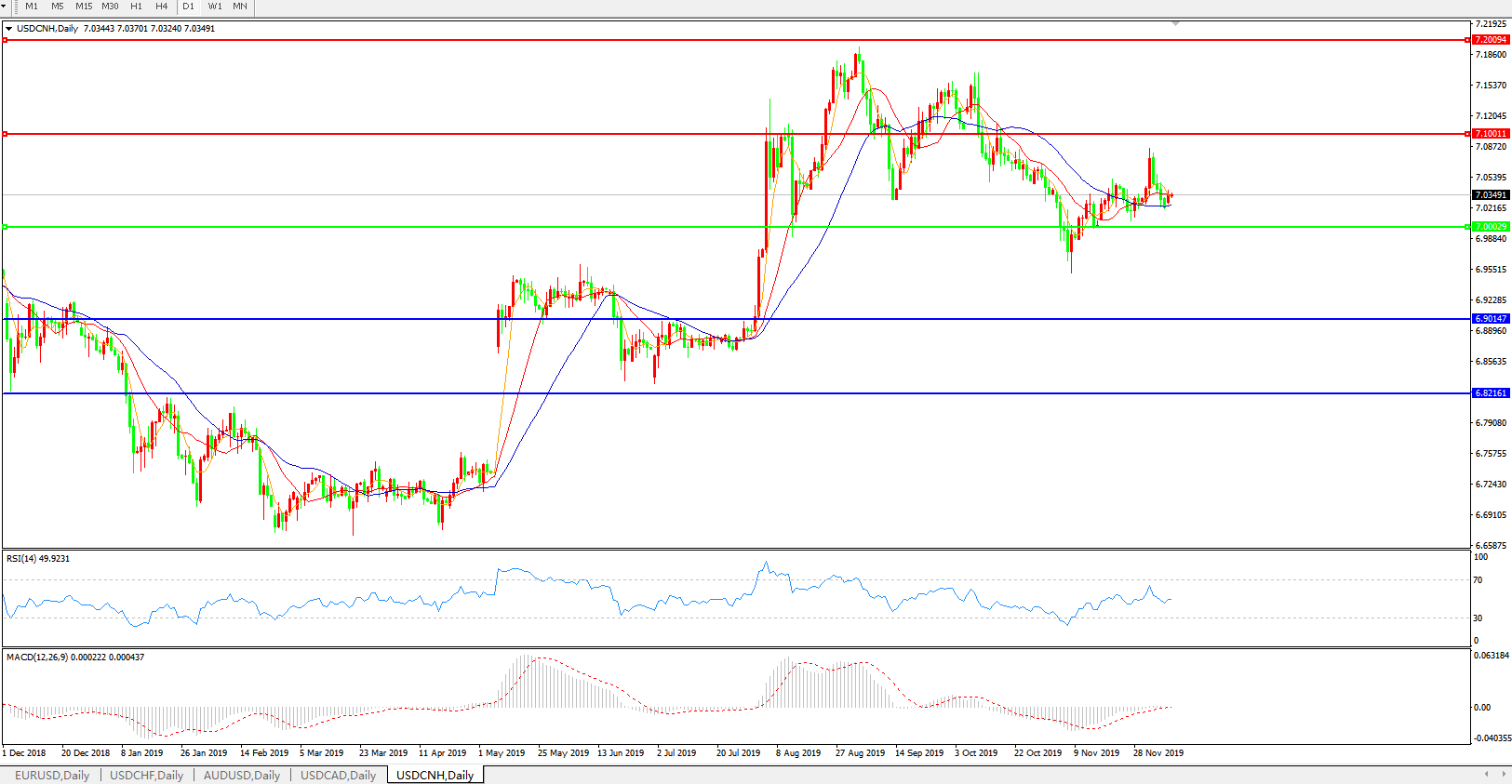 技术面简析:日图均线粘合无明显方向,汇价7.0关口上方开始窄幅波动,MACD自0轴下方逼近0轴且量能收缩几无,RSI震荡无方向,预计短期汇价将在7.0关口附近整理,中期汇价需等待美元指数及中美贸易谈判最新进展指引。