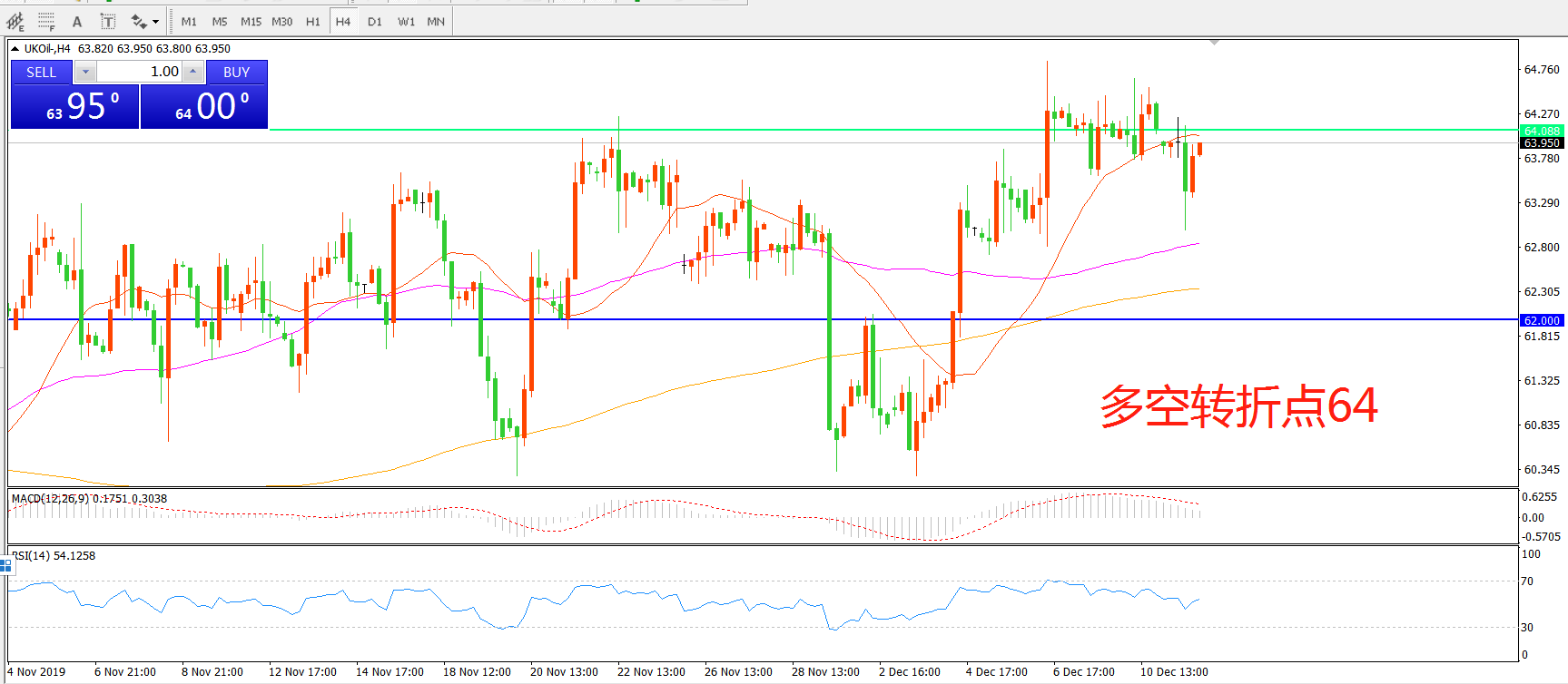 4小时图看,油价延续高位震荡,64美元依然是多空分水岭,均线系统呈多头排列,MACD红柱减少,RSI指标走平,日内延续震荡概率较大。