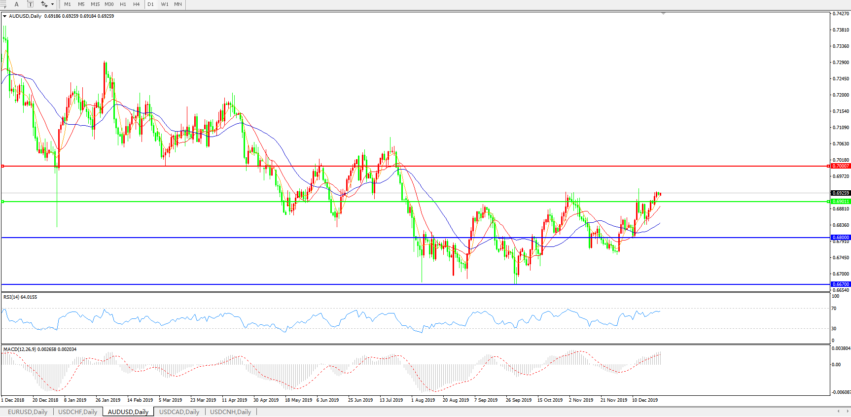 技术面简析:日图均线整体呈多头排列,汇价继续小幅上行,MACD继续上攻且量能维持放量,RSI震荡中微走高,短线关注0.69关口支撑是否有效,预计汇价大概率将进一步走高。