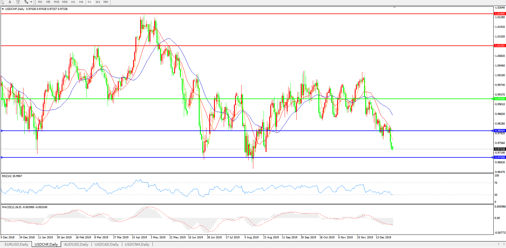 美元兑瑞郎在周五欧市盘初再现跳跌,触及日低0.9766,这也是自8月26日以来四个月新低,主要原因在于圣诞节假期后欧洲市场恢复开盘之际欧系货币受市场仓位整影响普涨,带动了瑞郎一并走强。同时,投资者对应明年美国大选年所带来的政治经济扰动仍有所忌惮,令美元加倍承压,而避险货币瑞郎则受到追捧;分析师指出,在进入2020年之后,全球经济及贸易前景仍然存在变数,同时,英国脱欧和美国大选等国际地缘政治事件还会强化市场担忧心理,在此状况下,避险货币瑞郎理应会受到进一步热捧,汇价可能继续走强; 美元兑瑞郎此后的下跌目标将是今年8月初的低点0.9660,失守该点位将意味着美元兑瑞郎自2018年2月以来的反弹趋势彻底破溃。然而,瑞郎过度走强可能引发瑞士央行兑现其之前承诺再度入市干预,这将为其明年走势带来额外不确定性