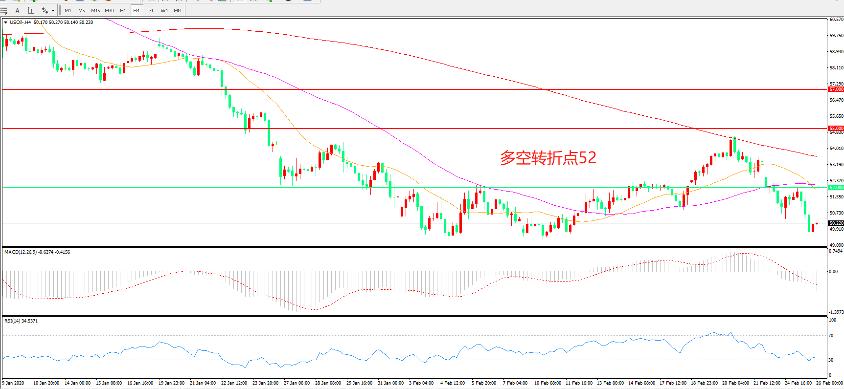 周二(2月26日),意大利、韩国等国的疫情持续肆虐,这令原油需求面的威胁日益增加,美国WTI原油震荡下行,收报46.76美元/桶。周三凌晨,美国石油协会公布数据显示,当周API原油库存增加130万桶,低于预期,数据公布后,美油短线快速拉升,收报50.07美元/桶。晚间23:30分将公布EIA原油库存数据,务必重点关注。