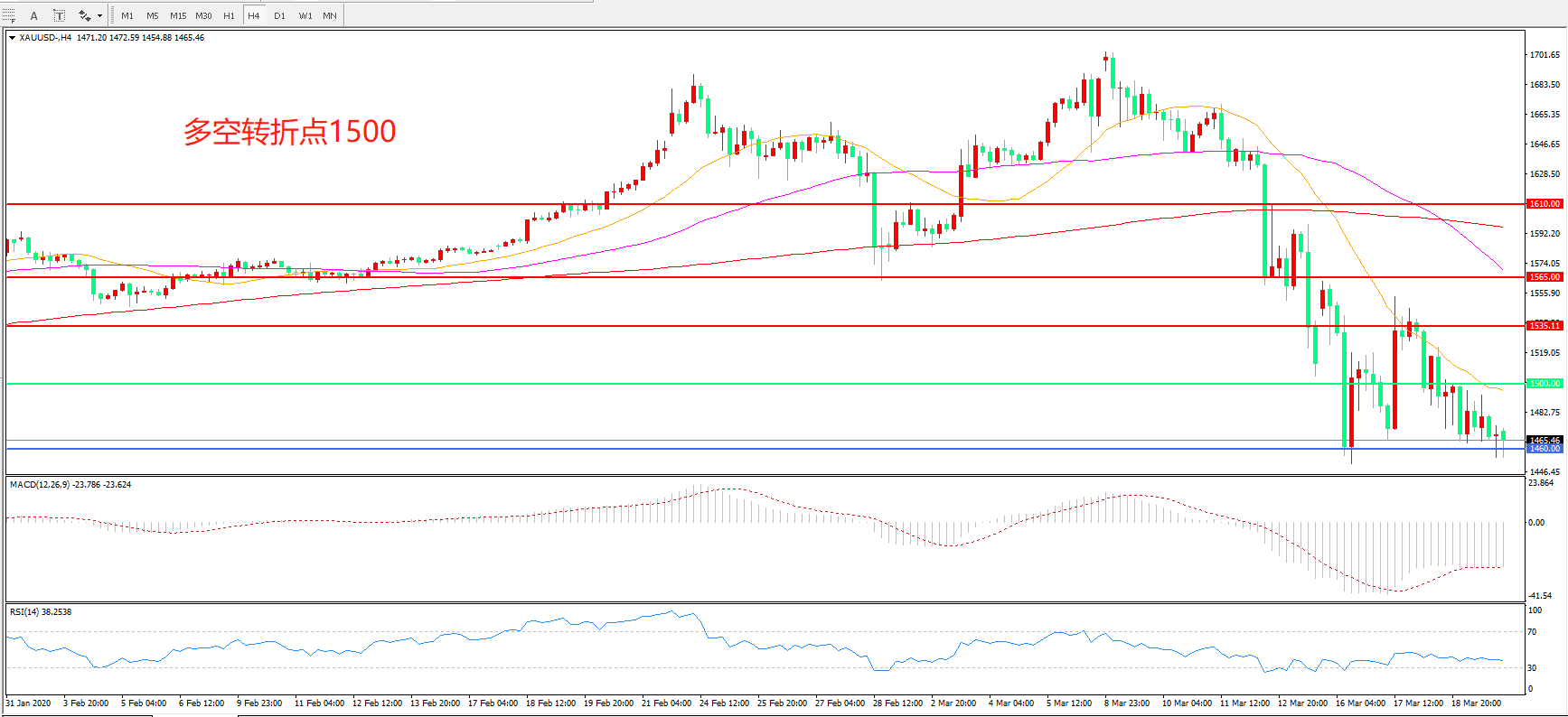 近期全球资产所表现出来的特点:股票跌、债券跌、黄金跌、美元涨,这是美元流动性紧张的典型表现,即投资机构将海外头寸卖出,资金流回美国以补充保证金,也是黄金暴跌不止的原因。周四(3月20日),飙升的美元依然给金价带来巨大压力,现货黄金震荡下行,收报1468.41美元/盎司。