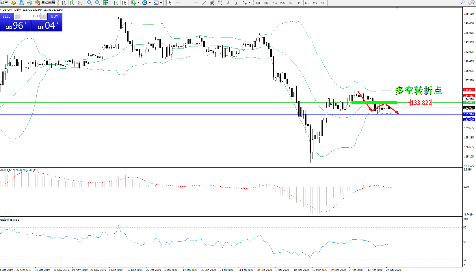 交易策略:133.822下方看跌,目标131.914131.029