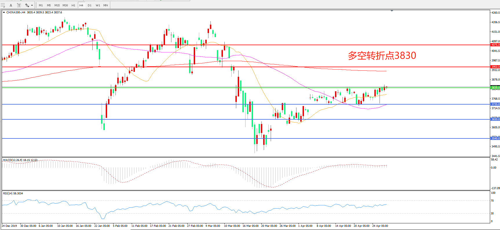 4小时图看,沪深300延续区间震荡,长下影的锤子线显示下方支撑较足, 3830成为短期阻力,均线系统走平,MACD红柱增加,RSI指标走平,日内延续上行概率较大。
