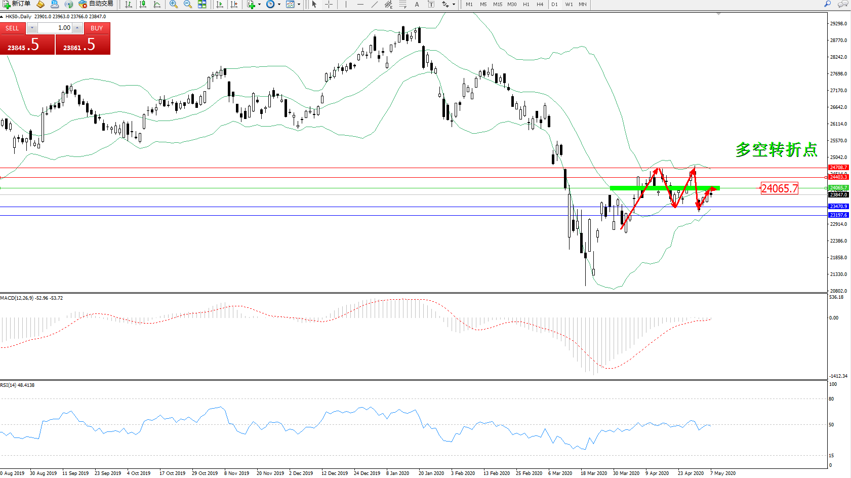 技术点评:高位双顶形态形成后开始震荡回撤下移,处于布林带指标中下轨区间持续弱势整理上移,布林带指标呈收口走势中,波幅空间逐渐收窄,关注中轨附近节点,MACD指标处于0轴线附近弱势徘徊中,RSI指标处于50均衡线附近持续整理平移中;
