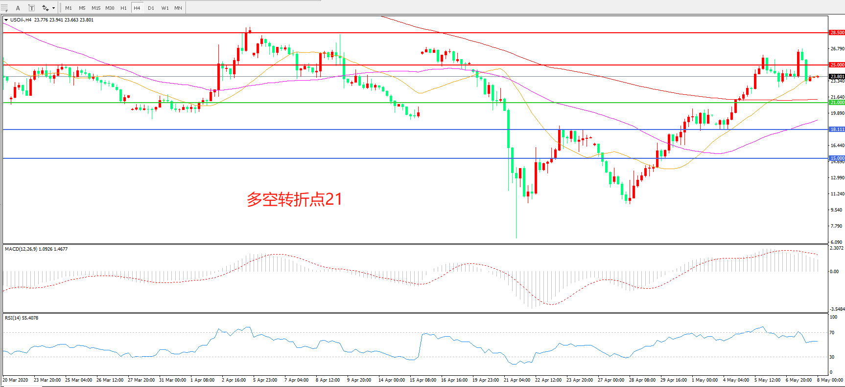 周四(5月7日),油价的走势在可以说非常震荡,在亚盘时段,沙特上调销往欧美的所有原油和大部分销往亚洲原油的官方售价,提振了原油价格,美油涨幅一度高达11%,突破26美元一线,但供应过剩压力仍然存在,最终美国WTI原油小幅下跌,收报23.78美元/桶。