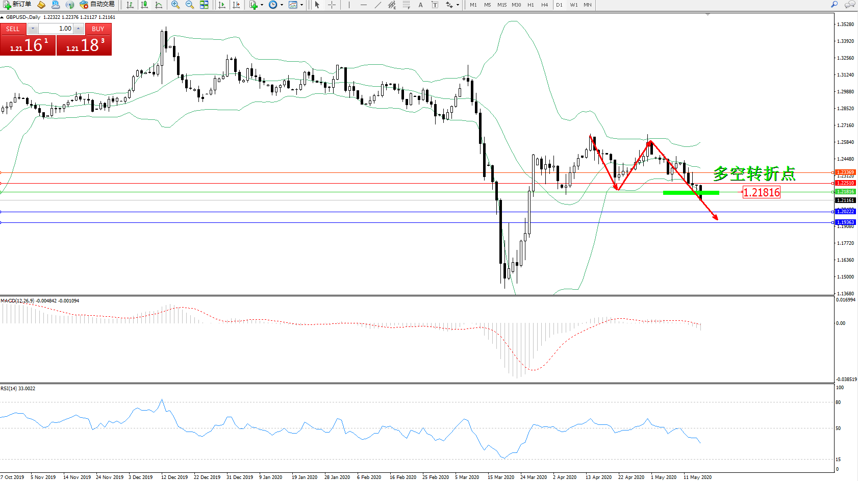 交易策略:1.21816下方看跌,目标1.20222、1.19363
