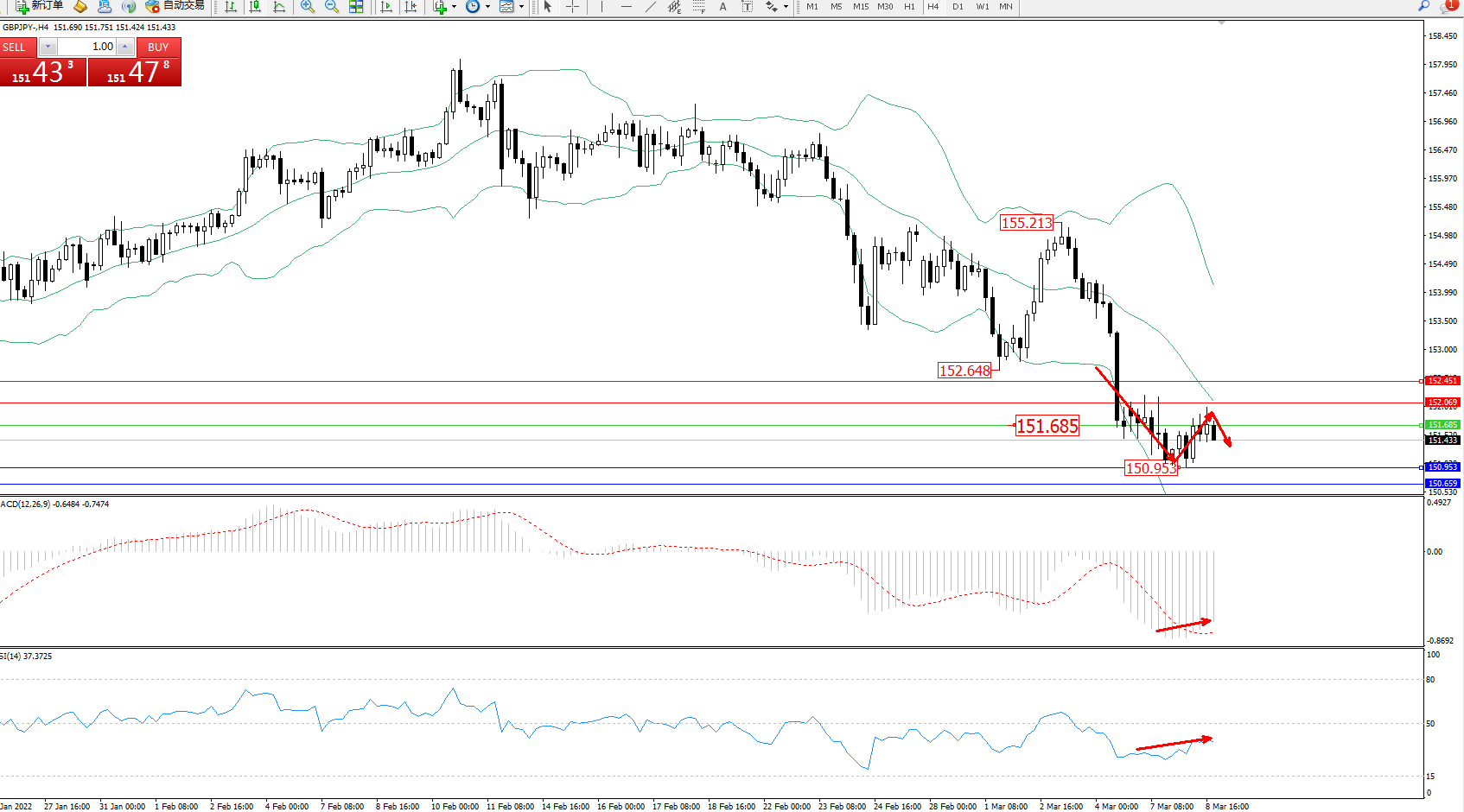 交易策略:151.385下方看跌,目标150.953、150.659