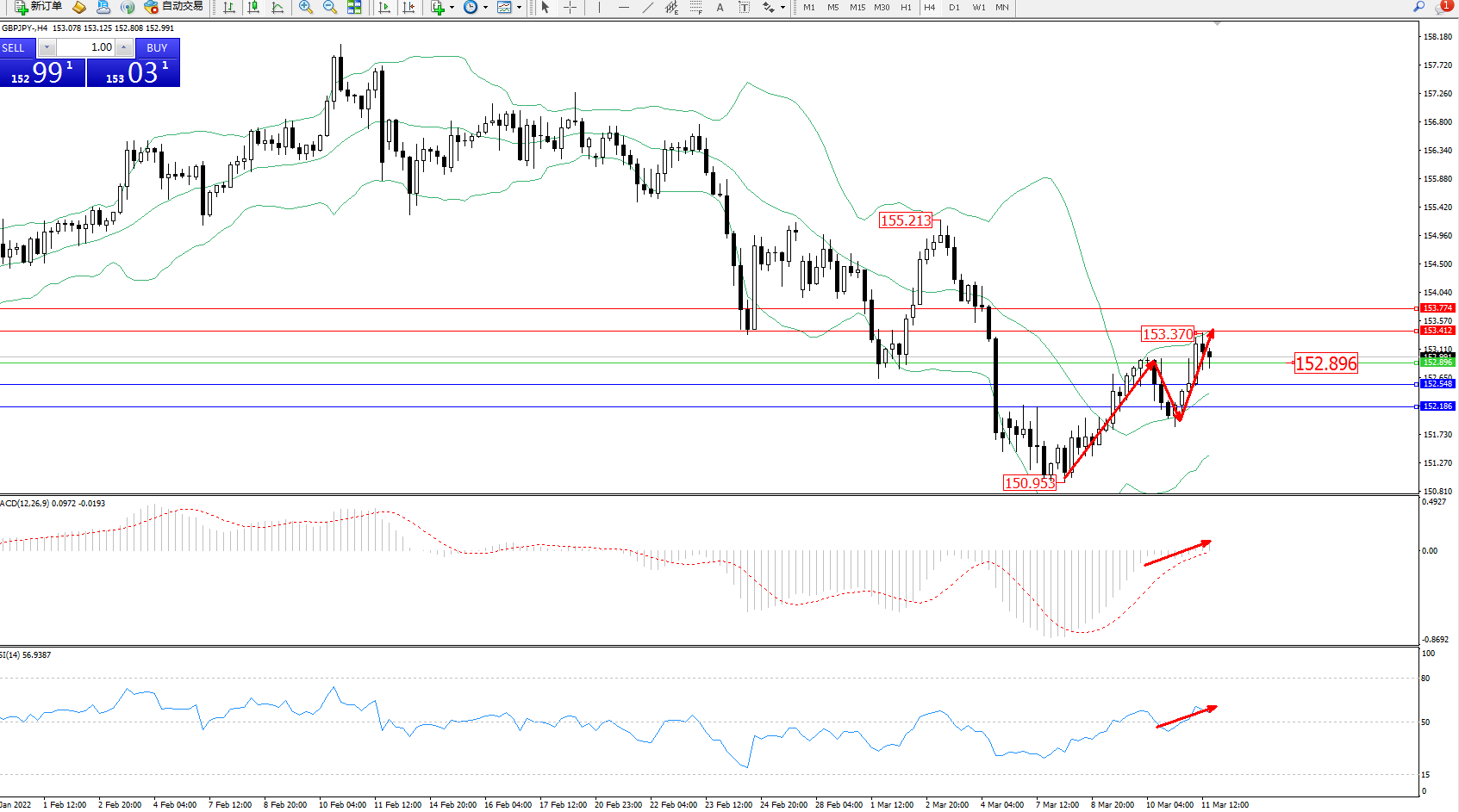 交易策略:152.896上方看涨,目标153.412、153.774